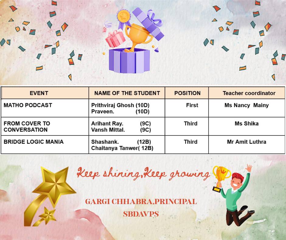 Our students did us proud by excelling in various events organised by DLDAV PITAMPURA.Congratulations to the winners and their mentors...(Click Here for more details)